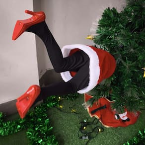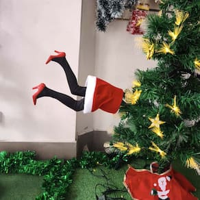 As pernas de Mamãe Noel possui movimento, parecendo que realmente está presa na árvore e precisa de ajuda. É diversão garantida, perfeito para encantar crianças e adultos, criando um ambiente leve e alegre.