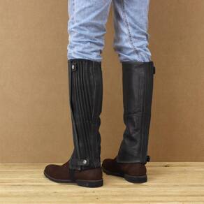 Perneira Bronc-Steel fabricada em couro na cor Preta, possui fechamento por zíper reforçado, costuras reforçadas, duas presilhas de pressão para maior firmeza e elástico na parte inferior que passa pelo solado do calçado.