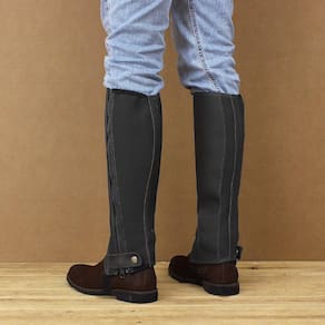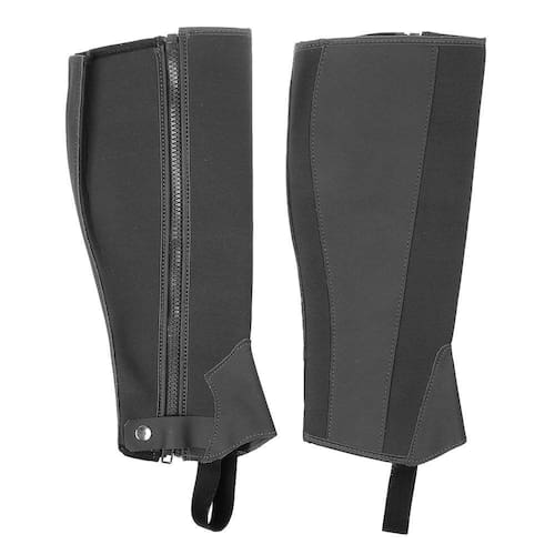 Perneira Bronc-Steel fabricada em neoprene na cor Preta, possui fechamento por zíper reforçado, partes reforçadas em couro, costuras reforçadas, presilha de pressão para maior firmeza e elástico na parte inferior que passa pelo solado do calçado.