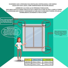 Exemplo: Janela: 50cm (L) x 50cm (A) = Persiana: 60cm (L) x 140cm (A).