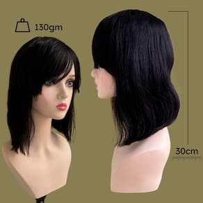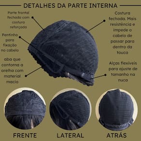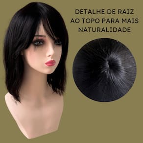 - Cabelo 100% humano (Sem fios sintéticos); - Wig tradicional; - Cabelo liso (Após lavagens é possível que surjam mais ondulações); - 30 centímetros de comprimento; - Densidade em 150% (Volume de cabelo); - Alças internas para regulagem de tamanho na cabeça; - Tamanho da peruca M (Adapta-se bem a maioria dos tamanhos de cabeça).
