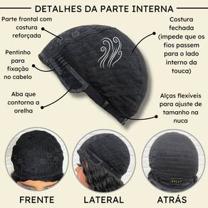 - Tamanho da peruca M (padrão) com alças internas ajustáveis;- Touca interna fechada (Os fios não embaraçam para dentro).