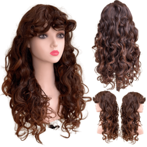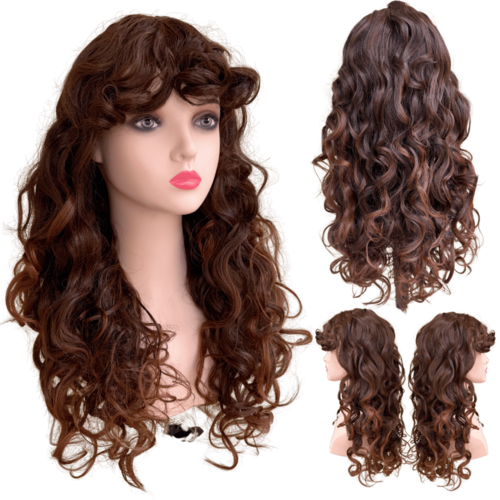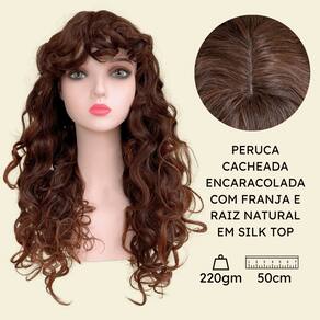 Peruca encaracolada ondulada castanho claro franja organica