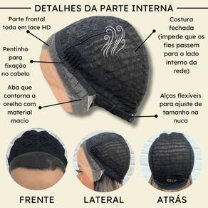 - Fibra 100% orgânica futura; - 30cm de comprimento; - Aceita chapinha até 200º; - Front Lace 13x1 com tela HD; - Possui três pentes internos para maior fixação; - Peso do produto 165gm em média; - Tamanho da peruca M (padrão) com alças internas ajustáveis. Marca: LIONSWIG
