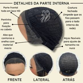 - Fibra 100% orgânica futura; - 30cm de comprimento; - Aceita chapinha até 200º; - Front Lace 13x1 com tela HD; - Possui três pentes internos para maior fixação; - Peso do produto 165gm em média; - Tamanho da peruca M (padrão) com alças internas ajustáveis. Marca: LIONSWIG