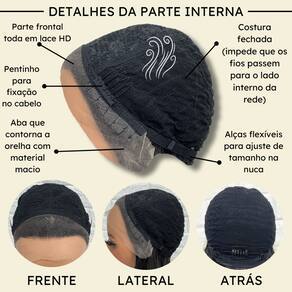 - Fibra 100% orgânica futura; - 30cm de comprimento; - Aceita chapinha até 200º; - Front Lace 13x1 com tela HD; - Possui três pentes internos para maior fixação; - Peso do produto 165gm em média; - Tamanho da peruca M (padrão) com alças internas ajustáveis. Marca: LIONSWIG