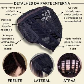 - Fibra orgânica premium biofibra; - Densidade em 140%; - 25cm de comprimento; - Front Lace com repartição esquerda; - Aceita chapinha até 180º ; - Possui alças internas para regulagem; - Possui três pentes internos para maior fixação; - Peso do produto 135gm em média; - Tamanho da peruca M com alças internas ajustáveis.