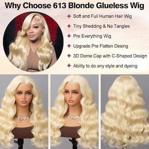 - Vantagem de cabelo humano da peruca 613: esta peruca loira sem cola não precisa de cola, fácil de usar e levar! A peruca tem linha do cabelo natural pré-arrancada, então não há necessidade de arrancamento adicional, tornando-a ainda mais natural e bonita. A nova peruca loira de cabelo humano atualizada pode ser usada em 15 anos sem nenhuma habilidade. Peruca sem cola torna a instalação mais fácil, basta usar e ir, economize seu tempo e energia. Perfeito para iniciantes e mulheres ocupadas que valorizam a conveniência