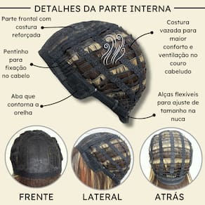 - Fibra orgânica premium; - 45cm de comprimento; - Aceita chapinha até 200ºC; - Peso 180g em média; - Possui três pentes internos para maior fixação; - Tamanho único com alças internas ajustáveis;- Touca interna vazada (Maior respiração no couro cabeludo). Marca: Não Informado