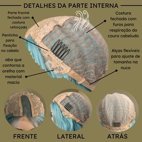 1 - Fibra tipo kanekalon; 2 - Densidade em 140% (Quantidade normal de cabelo); 3 - 80cm de comprimento (Como sugere a última imagem do anúncio); 4 - Mini Lace na região central da cabeça; 5 - Aceita chapinha até 170º ; 6 - Alças internas para regulagem; 7 - Possui três pentes internos para maior fixação. 8 - Tamanho da peruca M (Adapta-se bem a maioria dos tamanhos de cabeça).