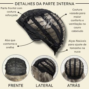 - Fibra kanekalon; - 40cm de comprimento; - 180 gramas em média; - Temperatura máxima aceita 160º; - Tamanho único com alças ajustáveis; - Parte interna aberta para maior conforto e respiação do couro cabeludo.