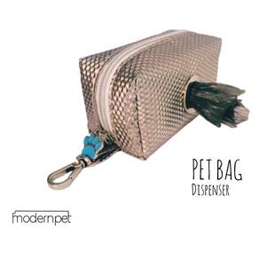 Pet Bag Dispenser além de prático e fácil de levar nos passeios do seu amigão, possui um design elegante com tecido metalizado e mosquetão para prender na guia, bolsa ou cinto.