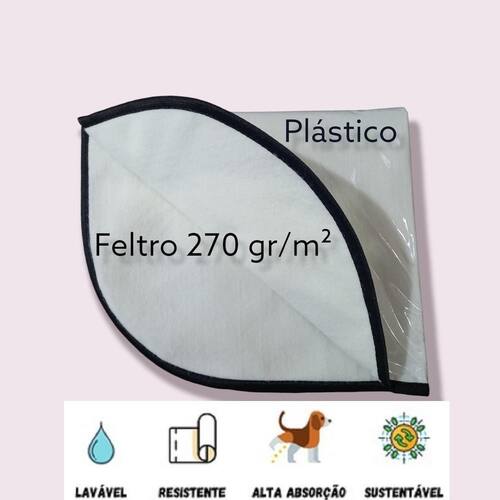 =============================================== Especificação do produto: Fabricação própria, fabricado com duas camadas. A primeira com alta absorção composição: feltro 270 Gr/m, aproximadamente 4 mm de espessura ; A segunda impermeável para retenção da urina, impedindo que vaze para o chão. composição: plástico maleável de 0,10 mm , com borda viés preto de 22 mm. Produto ecológico e bem mais econômico do que os descartáveis e absorve mais. Parte superior própria para alta absorção. Fácil de usar, apenas passar na água corrente e colocar pra secar. Para os pets macho, orientamos a colocar um cone no centro do tapete. Pode ser utilizado no interior do sanitário canino, não inala odor. Garantimos a qualidade do produto.