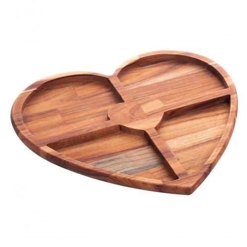 Petisqueira de Madeira em formato de coração, com 4 divisões, para servir diversos tipos de patês, queijos, torradas em um único recipiente e com requinte! A madeira Teca é reconhecida em todo o mundo como madeira tropical, dura e de alta qualidade. Essas tábuas são produzidas com esse material para garantir durabilidade, estabilidade e resistência ao ataque de cupins, brocas e outros insetos.