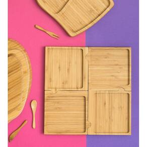 Essa é a Petisqueira de Bambu Quadrado desmontável, que tem a missão de deixar os petiscos ao alcanse de todas as mãos Ela é dividida em 04 partes com encaixes que podem ser reajustadas em diferentes formas, resultando em diferentes figuras. São muitas as comninações - Inclusive se você tiver mais de uma. Seu material é de bambu, um antibactericida natural.