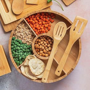 A petisqueira giratória bambus é ideal para você usar em festas e comemorações. Com 5 divisórias, permite oferecer variados tipos de petiscos. É uma peça funcional, fabricada em bambu, material ecologicamente correto.