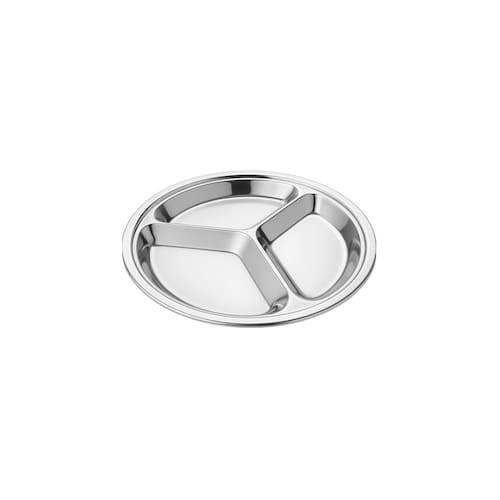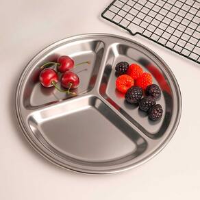Petisqueira redonda em aço inoxidavel. A petisqueira redondo possui tres divisorias, versatil, facil de limpar e duravel. A bandeja é indicada para buffet, restaurantes e bares. Porem fica perfeita tambem para receber amigos em casa. Produzido em aço inox previne de impurezas, ferrugem e indicado o uso na maquina de lavar louça.