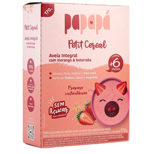 Petit Cereal Aveia PAPAPÁ morango e beterraba 170g O Petit Cereal de Aveia Integral com Morango & Beterraba da Papapá é a escolha perfeita para introduzir uma alimentação saudável e saborosa para o seu bebê a partir dos 6 meses de idade. Com uma composição cuidadosamente selecionada, este cereal infantil de preparo instantâneo é formulado com 51% de aveia integral, proporcionando uma fonte nutritiva e rica em minerais naturais.