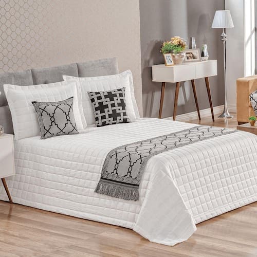 Pezeira King Grécia Preto Valle Enxovais 5 Peças A Pezeira da Linha Grécia da Valle Enxovais decora a sua cama, e traz sofisticação para o seu quarto. Confeccionada em jacquard, dupla face, com 60% algodão e 40% poliéster. Acabamento com franja.Composição:1 pezeira 2,40m x 0,40m2 capas de almofada 45cm x 45cm2 refis de almofada 45cm x 45cm Tamanho - King
