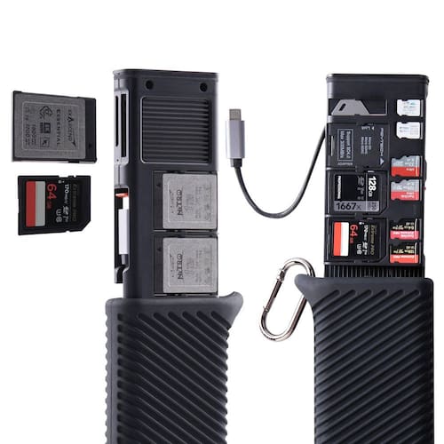 - Combina um leitor de cartões CFexpress Tipo B e SD com um estojo protetor para armazenamento.