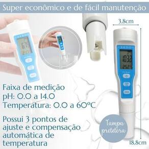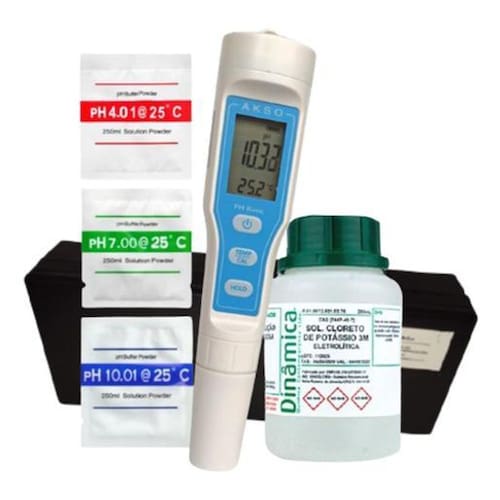 Phmetro medidor de ph + 03 calibradores temp. Digital com atc Fazer suas leituras de ph e temperatura agora com o medidor akso phbasic ficou muito mais fácil e confiável, pois ele é muito simples de ser utilizado devido a sua calibração automática e também confiável pois proporciona resultados muito precisos. Este medidor de ph possui eletrodo substituível, visor lcd com indicação dupla ph e temperatura e compensação automática de temperatura atc . Também indica o nível de cargas das baterias. Calibração automática em até 3 pontos. Na compra do phmetro você receberá também - calibradores ph 4.0 ph 7.0 e ph 10 - cada sache permite o preparo de 250 ml de solução . Acompanha também: 1 frasco de solução kcl3m 250 ml ideal para ativação e hidratação do eletrodo quando armazenado . ======================================================================= Aplicação: medir temperatura e o ph entre 0,0 a 14 de soluções aquosas ======================================================================= Faixa de medição: Ph: 0.0 a 14.0 Temperatura: 0.0 a 60c Resolução: ph: 0.01 Temperatura: 0.1c Exatidão: ph: 0.05 Temperatura: 1c Pontos de ajuste calibração : ph 4.01, 7.00 e 10.01 Compensação automática de temperatura atc : 0 a 60c Temperatura de operação: 0 a 60c Umidade de operação: 10 a 95%ur sem condensação Grau de proteção: ip65 Alimentação: 4.5vdc 3 pilhas lr44 Desligamento automático: 5 minutos Dimensões lxaxp : 38 x 188 x 38mm Peso: 90g ======================================================================= Funções adicionais: -eletrodo substituível -compensação automática de temperatura atc -calibração automática em até 3 pontos -seleção c/f -visor lcd com indicação dupla ph e temperatura e nivel de carga da bateria. -função hold congelamento de indicação -desligamento automático após 05 minutos de inatividade. ======================================================================= Contém: 1 phmetro modelo phbasic v2 1 solução kcl 3m - frasco 250ml pronto para uso . 3 sachês calibradores ph 4,0 ph 7,0 e ph 10,0 . 1 estojo. 1 manual de instruções em português 3 baterias podem já estar instaladas . ======================================================================= Dúvidas frequentes: P: este equipamento mede ph de semi-sólidos R: este excelente medidor faz leitura em soluções aquosas com a viscosidade próxima da água
