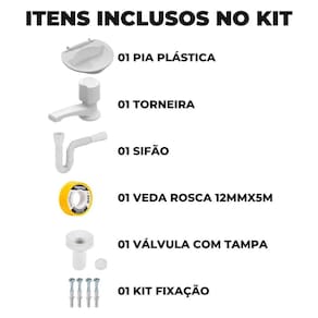 ITENS INCLUSOS 01 Pia Plástica 01 Válvula Com tampa 04 Buchas S6 04 Parafusos 3,5 x 30mm 01 Rolo de Fita Veda Rosca 12mm x 5m 01 Torneira Plástica 01 Sifão