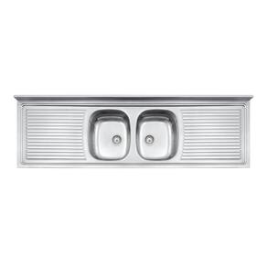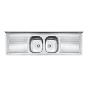 Pia com 2 cubas centrais escorredor. Aço Inox AISI 304. 0,7 mm de espessura. Capacidade: 15,5 15,5 L Acabamento pré-polido. Acompanha válvula de 4 1/2 . NA Ean: 7894693749659