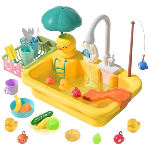 O conjunto de brinquedos de pia 2 em 1 inclui acessórios de brinquedos flutuantes coloridos, permitindo que seus filhos aproveitem o jogo de cozinha enquanto simulam como é a pesca real para desenvolver sua coordenação olho mão. Os brinquedos de pesca e patos de brinquedo também podem ser utilizados como brinquedos de banho e piscina. Os brinquedos de dramatização de cozinha incluem copo de plástico, prato de plástico, escova, detergente para brincar, conjunto de garfo e faca de plástico e brinquedos de comida para as crianças brincarem.