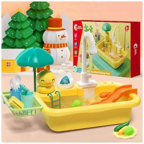 Este conjunto de pia de brincar com água corrente é perfeito para crianças que adoram brincar de cozinha e pesca. A torneira elétrica à prova d água permite que seus filhos lavem seus brinquedos de comida, copos e pratos com água corrente enquanto se divertem na cozinha. O conjunto é feito de material plástico ABS de qualidade, inodoro e não tóxico, sem BPA, proporcionando um espaço de brincar seguro e amplo para as crianças.