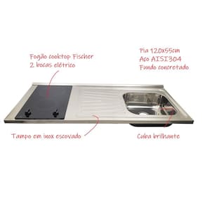 A pia fogão Fabrinox é muito diferente! Sabe por quê? Nossa pia é fabricada no melhor aço inox: o AISI304! Nosso fogão é independente da pia, ou seja, você pode eventualmente comprar outro fogão similar no futuro, sem precisar trocar a pia, ou levá-lo a um reparo na assistência técnica e continuar com a sua pia! **ATENÇÃO: NÃO PODEMOS GARANTIR QUE ENCAIXE SEM ADAPTAÇÕES EM GABINETES PADRÃO DE MERCADO**
