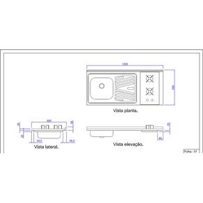 Sobre a pia: Pia de cozinha de aço inox, para gabinete, medindo 120x55Cm, cuba esquerda com furo para torneira TIPO DE AÇO: AISI304 (NÃO-FERRÍTICO) INSTALAÇÃO: SOPREPOR GABINETE / MÃO-FRANCESA/MURETAS DE ALVENARIA MEDIDAS: 1200x550mm CUBA: SIMPLES 360x340x140mm ACABAMENTO: TAMPO ESCOVADO / CUBA BRILHANTE PREENCHIMENTO: CONCRETADO VALVULA: 3 ½ NÃO INCLUSA ANTI-RUÍDO: NÃO INCLUSO GARANTIA: 1 ANO