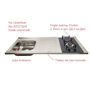 A pia fogão Fabrinox é muito diferente! Sabe por quê? Nossa pia é fabricada no melhor aço inox: o AISI304! Nosso fogão é independente da pia, ou seja, você pode eventualmente comprar outro fogão similar no futuro, sem precisar trocar a pia, ou levá-lo a um reparo na assistência técnica e continuar com a sua pia! **ATENÇÃO: NÃO PODEMOS GARANTIR QUE ENCAIXE SEM ADAPTAÇÕES EM GABINETES PADRÃO DE MERCADO**