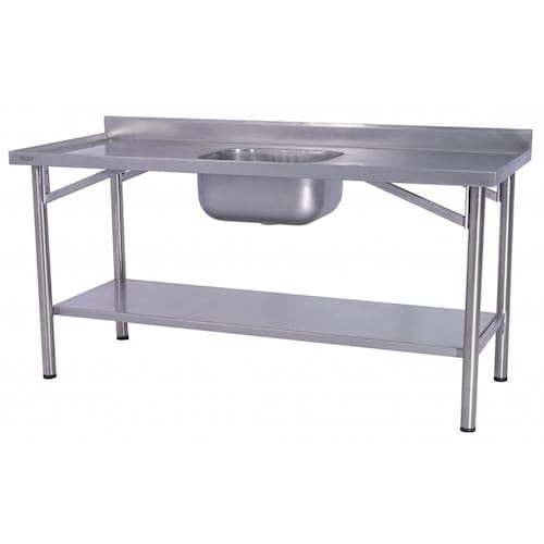 A altura da pia do chão até o tampo é de 89cm, enquanto a altura do chão até o encosto é de 96cm. A montagem é fácil e rápida, através de encaixe tipo cunha. Além disso, os terminais plásticos nos pés possuem regulagem de altura para maior praticidade. A pia industrial também possui um paneleiro liso para armazenar e organizar seus utensílios.