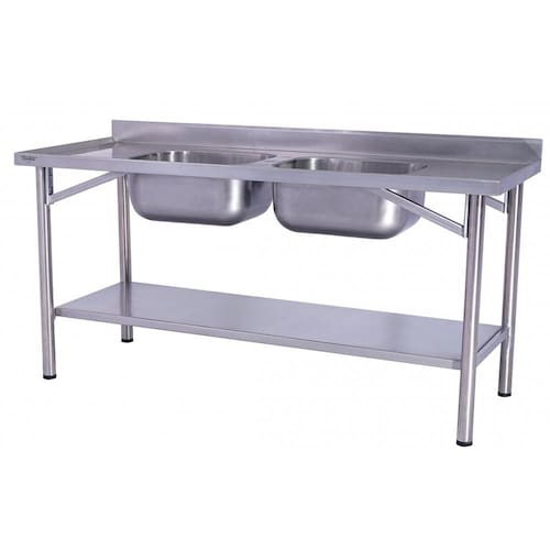 A Pia Industrial Benfati é feita de aço inox 304 de alta qualidade, com tampo de 0,80mm e bordas de retenção de líquidos e encosto de 10cm. As cubas também são feitas de aço inox 304 e tem tamanho de 50x40x25cm cada. A estrutura é feita de tubo 2" aço inox 304, garantindo resistência e durabilidade.