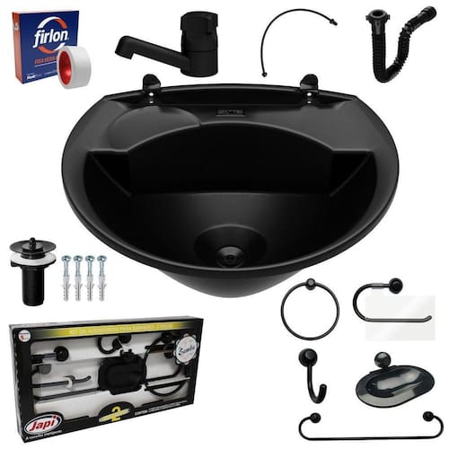 Pia lavatório banheiro plástico 4l preta + kit para banheiro redondo 5 pçs preto