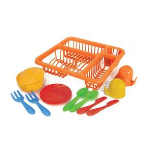 Acompanha kit com escorredor, panelinhas, pratos, copos, talheres e uma esponjinha