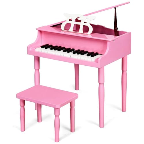 A certificação ASTM garante segurança: Delicadamente feito de ABS de alta qualidade e pernas de madeira maciça de bétula, este piano infantil apresenta desempenho perfeito em durabilidade duradoura e grande robustez. Além disso, o acabamento pintado não prejudica a pele das crianças durante o uso e os cantos arredondados trazem uma sensação total de segurança. Piano de 30 teclas com tamanho apropriado: Vindo com 30 teclas pretas e brancas, este lindo piano oferece muita diversão musical e som preciso para seus filhos. Além disso, o tamanho das teclas é menor do que o tamanho padrão de um piano real, o que pode caber perfeitamente nos dedos das crianças e fazer a transição para um piano maior à medida que crescem. Ótimo instrumento musical educacional: O artesanato requintado confere a aparência clássica e o som agradável deste piano, que atrairá a atração das crianças à primeira vista. Graças à estante de partitura e ao banco confortável, as crianças podem desfrutar de uma experiência musical envolvente e brincar com este instrumento de teclado com facilidade. Uma grande surpresa para seus filhos Este adorável piano de madeira de 30 teclas é um presente especial de aniversário ou de Natal para crianças com mais de 2 anos. Além de proporcionar o máximo de diversão em família, o piano de cauda contribui para o desenvolvimento da inteligência das crianças, melhora a coordenação motora e inspira a iluminação musical. Fácil de montar e limpar: Todas as peças e ferragens necessárias estão bem embrulhadas. Sob a orientação das instruções, o baby grand de 30 teclas é fácil de montar sem esforço. Além disso, a superfície lisa só precisa ser limpa levemente com pano úmido, economizando muito esforço e tempo na manutenção diária.