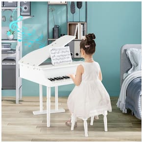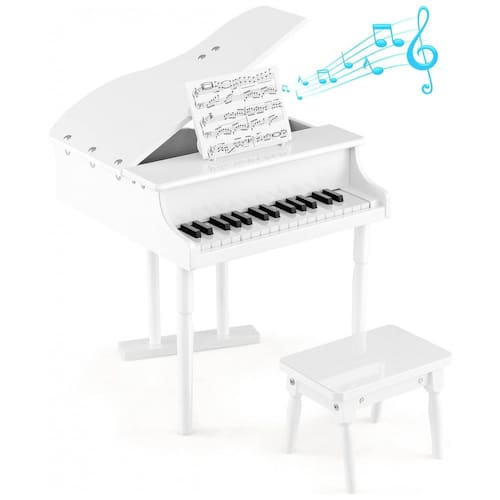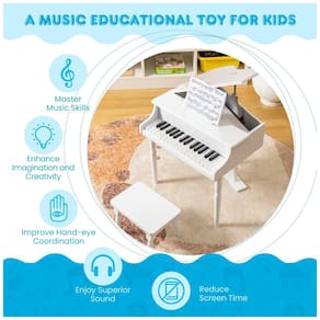 Experiência Maravilhosa para Piano: Com 30 teclas com tamanhos apropriados e altura da tecla 2,5 centímetros, este piano clássico para crianças fará seu filho tocar com mais intensidade e imerso na melodia elegante. O tamanho da chave é adequado para os dedos das crianças e cada chave é fácil de pressionar. Brinquedo educacional perfeito: O mini piano de cauda vem com um banquinho confortável para as crianças sentarem, para que possam brincar com mais aconchego. Além disso, projetadas com um suporte de música funcional, as crianças podem aprender a tocar piano com maior eficiência. Material e confiável: Todas as teclas de piano são feitas de ABS premium, que suporta batidas de dedo contínuas e de longa data. E as pernas do banquinho e do piano são construídas com madeira de bétula selecionada, que não é apenas resistente, mas também segura e amigável para as crianças. Detalhes pensativos: O piano de brinquedo de madeira adota um design flip top com uma peça de apoio durável, tornando o mais elegante. Além disso, a borda arredondada e a superfície pintada com spray não machucam a pele delicada das crianças , garantindo maior segurança. Presente ideal para o seu filho: Este conjunto de piano e banquinho para crianças será um presente perfeito para crianças de 3 a 8 anos. Será eficaz em inspirar potencial musical, promover discriminação sonora, melhorar a coordenação olho mão e reduzir o tempo da tela. Além disso, o piano ganhou a certificação ASTM e CPSIA.