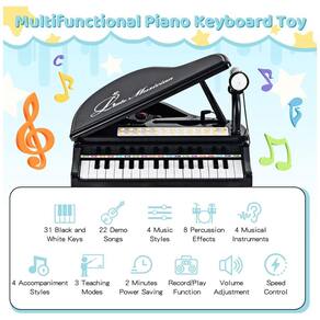 Teclado de piano multifuncional: Este brinquedo de teclado de piano multifuncional possui 31 teclas pretas e brancas, 22 músicas de demonstração, 4 estilos musicais, 8 efeitos de percussão, 4 instrumentos musicais, 4 estilos de acompanhamento, função de gravação, reprodução, ajuste de volume e controle de velocidade. Assim, criará diversão sem fim para os mais pequenos.