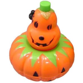 Super pião no formato de uma abóbora com LED's multicoloridos e som, motivo Halloween. Basta rodar a cabeça da abóbora e apertar o botão para o pião sair girando rapidamente e deixar todos com medo através de sua risada maligna e de seus efeitos de luz. Utiliza 3 baterias LR44 (inclusas).