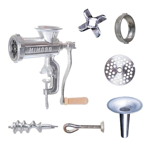 O moedor de carne manual n°10 da Mimoso é de fácil manuseio. Ele possui sistema de fixação por morsa que permite travar o moedor de carne em qualquer superfície plana. É uma máquina de moer carne prática, segura e higiênica. Suas peças podem ser desmontadas e lavadasO picador de carne n°10 também é indicado para moer legumes, milho verde e outros alimentos.Material : ferro fundido com acabamento estanhadoConjunto formado por: corpo, rosca, anel rosqueado, faca navalha, funil, disco perfurado 8 mm, parafuso fixador, manivela com cabo, porca borboleta.Acionamento manual. Manivela comprimento 21 cm.utilizado: moer carnes,legumes, milho verde, aipim, bacalhau e outros alimentos.PICADOR 10 ENTRADA COPO 10,0 cm