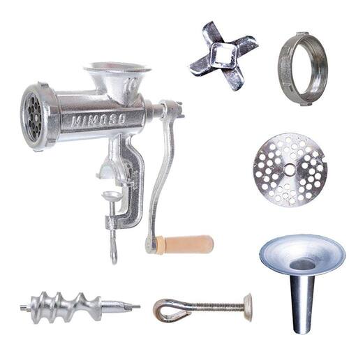 O moedor de carne manual n°10 da Mimoso é de fácil manuseio. Ele possui sistema de fixação por morsa que permite travar o moedor de carne em qualquer superfície plana. É uma máquina de moer carne prática, segura e higiênica. Suas peças podem ser desmontadas e lavadasO picador de carne n°10 também é indicado para moer legumes, milho verde e outros alimentos.Material : ferro fundido com acabamento estanhadoConjunto formado por: corpo, rosca, anel rosqueado, faca navalha, funil, disco perfurado 8 mm, parafuso fixador, manivela com cabo, porca borboleta.Acionamento manual. Manivela comprimento 21 cm.utilizado: moer carnes,legumes, milho verde, aipim, bacalhau e outros alimentos.PICADOR 10 ENTRADA COPO 10,0 cm Ean: 17895114007096