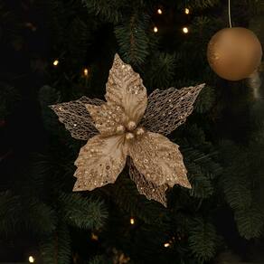 Leve sofisticação e brilho à sua decoração natalina com este pick decorativo de flor bico de papagaio, produzido em veludo champanhe com acabamento vazado, realçado por glitter e lantejoulas que proporcionam luminosidade e elegância.