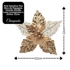 Pick Natalino Flor Bico de Papagaio Vazado em Veludo Champanhe – 22cm