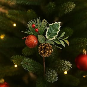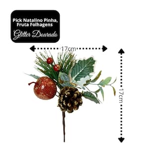 Transforme sua decoração natalina com este lindo pick decorativo de 17cm, composto por folhagens, pinha natural e fruta artificial com acabamento em glitter dourado, que proporciona brilho e elegância ao ambiente.