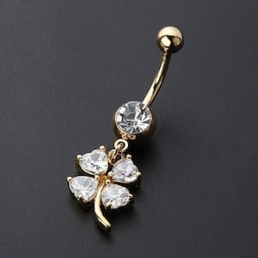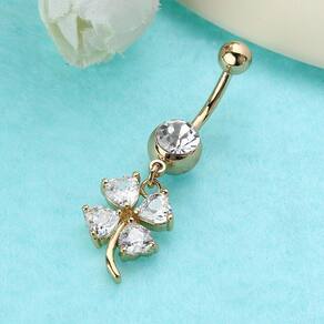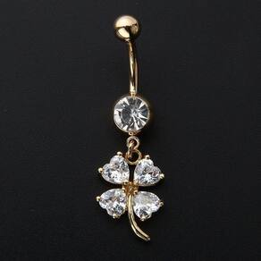 Piercing de umbigo em aço cirúrgico banhado a ouro.Pedras de zircônia em formato de trevoSimplesmente LINDOUma linda peça para ser usada no dia a dia e em qualquer ocasião.Os Piercings são peças em Aço e seus Pingentes em liga de zinco banhada com outro metal, neste caso as peças recebem um banho de Ouro peças douradas . Porém como qualquer peça banhada este banho pode sofrer desgaste independente de sua qualidade. Existem fatores que aceleram este processo: suor, contato com produtos químicos produtos de limpeza e cosméticos , cloro de piscina, água do mar, sabonete, entre outros produtos que podem agredir o banho da peça, danificando-o. Peças banhadas devem ser limpas apenas com uma flanelinha seca, de maneira leve.A durabilidade da peça depende do cuidado, e peças banhadas não são adequadas para serem usadas constantemente. Para uso contínuo recomendamos que se utilize peças que são somente no aço, sem banho e sem pingente.Seguindo estas dicas você terá sua peça por mais tempo. Marca: Decastro