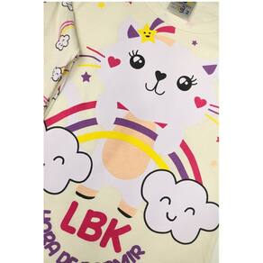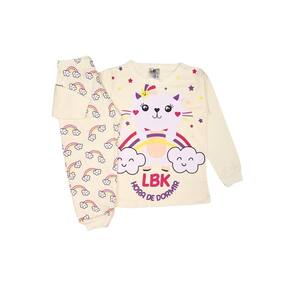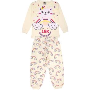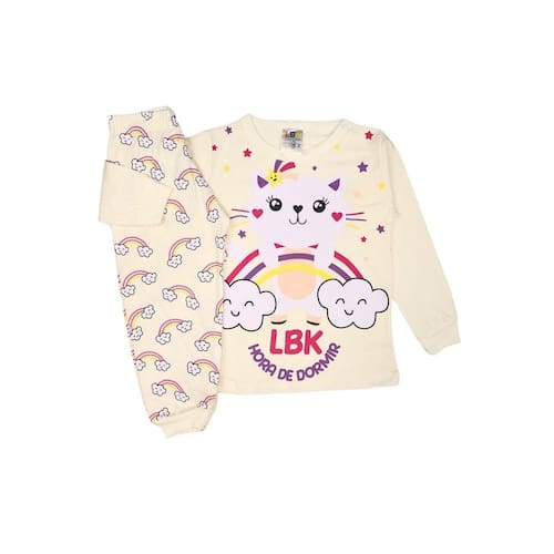 Pijama Bege com Estampa de Gatinha Malha Algodão Confortável