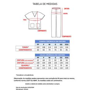 O Pijama cirúrgico ou Pijama Veterinário também chamado de Uniforme Cirúrgico (Calça + Camisa) é confeccionado em Oxford, tecido 100% poliéster.