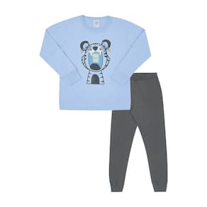 Pijama manga longo confeccionado em meia malha para os pequenos aventureiros. A camiseta na corhortênsia possuí estampa divertida de tigre bocejando com escrita "Rugido curto" e o detalhe esta na estampa que brilha no escuro. A calça na cor carbono possuí elastano na cintura para maior conforto na hora do sono. O pijama favorito dos pequeninos para a estação!\n