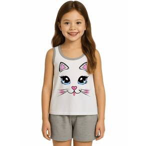 Pijama Infantil Regata e Short Estampa Gatinha - Branco - 6